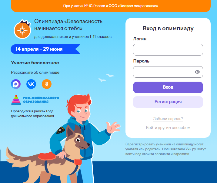 Онлайн-олимпиада пройдёт на образовательной платформе Учи.ру по адресу https :// safety - mchs. uchi. ru при участии МЧС России и ООО «Газпром межрегионгаз».